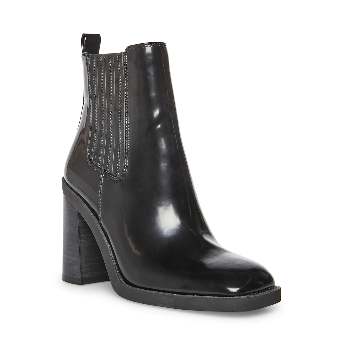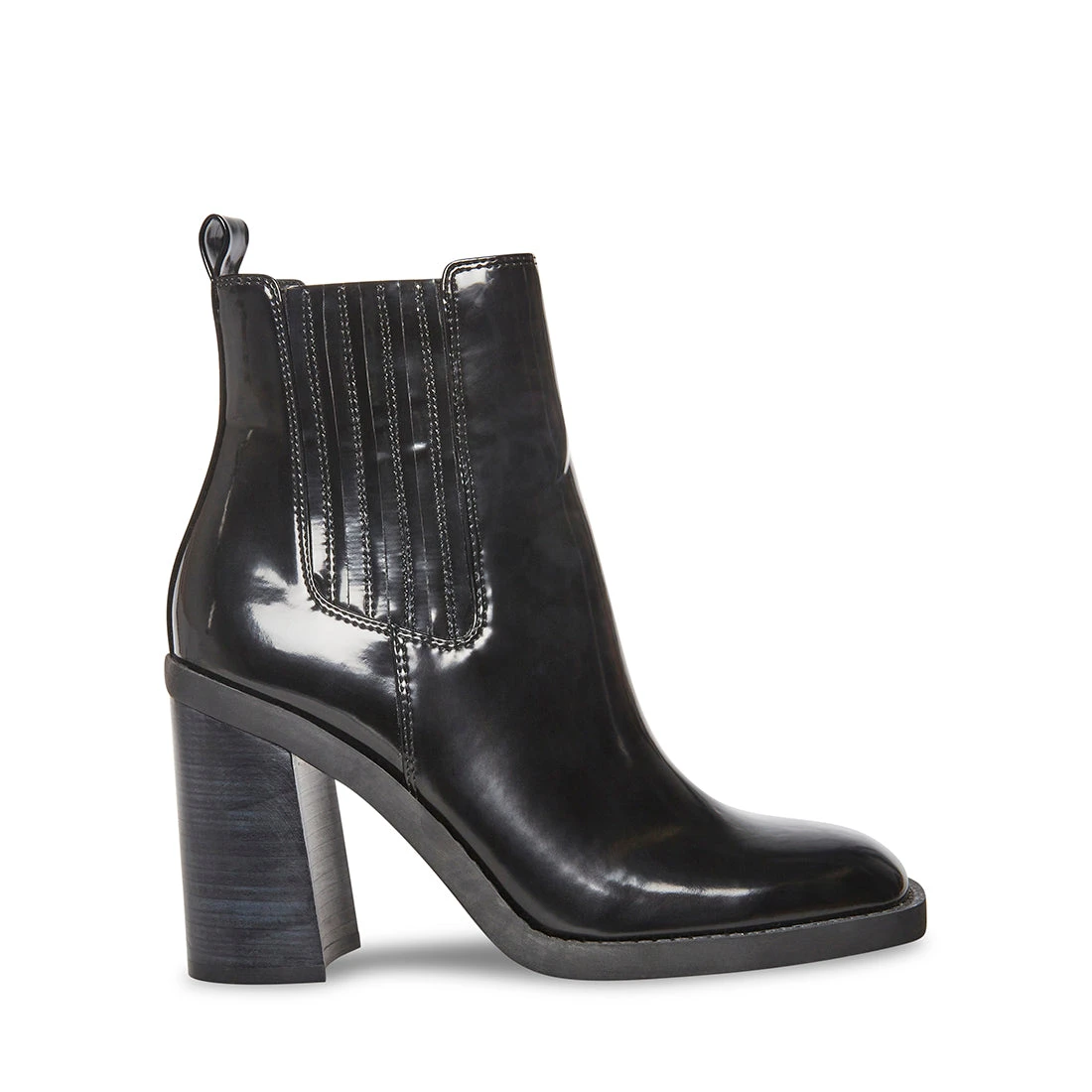 ACKER is the wardrobe staple we can’t get enough of. This shiny Chelsea boot has a stacked block heel and features elastic side panels for convenient on and off.