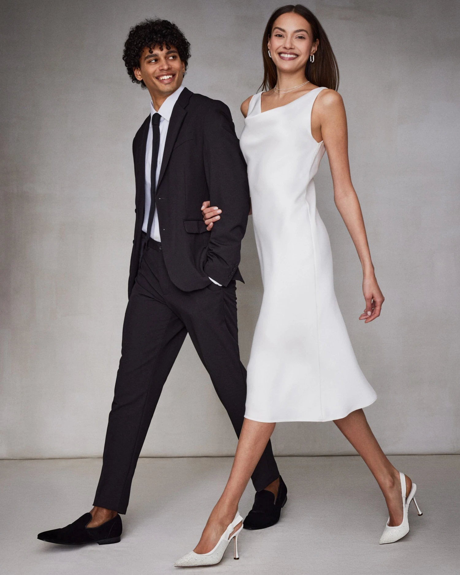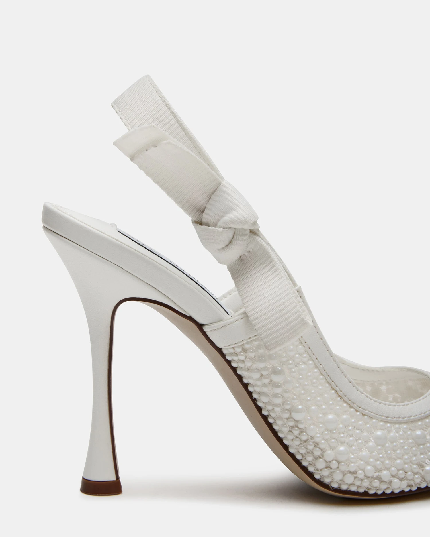 A grosgrain ribbon wraps around the slingback strap of the BRI point toe stiletto pump and finishes with a bow accenting the side of the shoe.