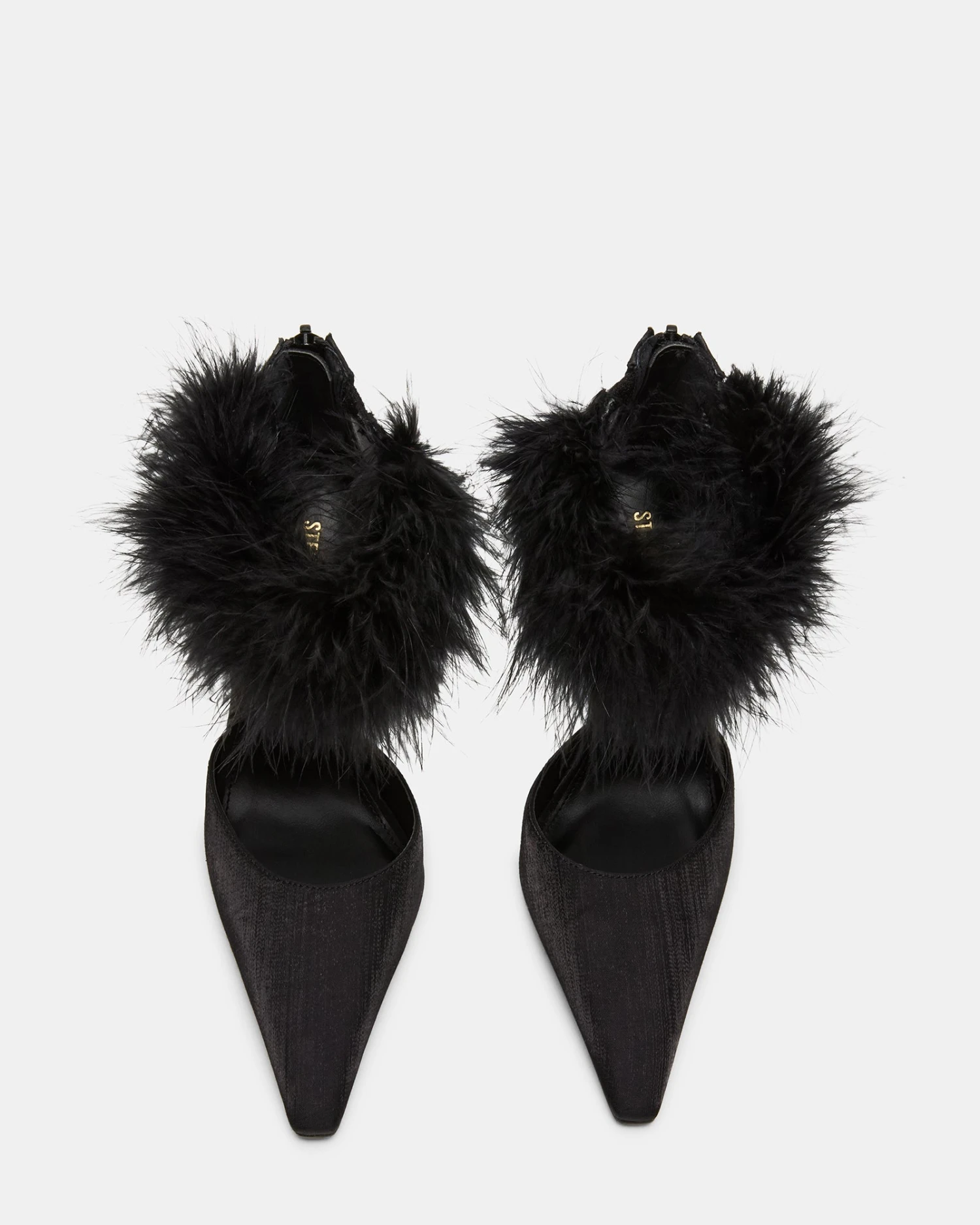 Elevate your style with the ELUSIVE BLACK SATIN pump, featuring a sleek pointed-toe silhouette paired with a slender stiletto heel for timeless sophistication. The delicate feather ankle strap adds a unique, refined touch that enhances both elegance and comfort, making this shoe an exquisite choice for occasions that demand a standout accessory. Crafted to combine grace and modern flair, it’s perfect for those seeking a statement piece that complements any chic ensemble.