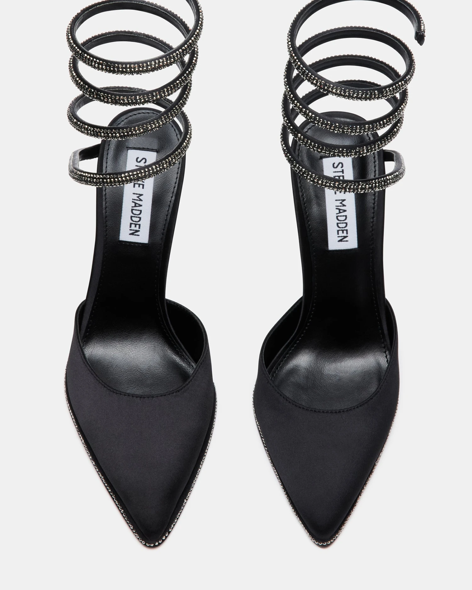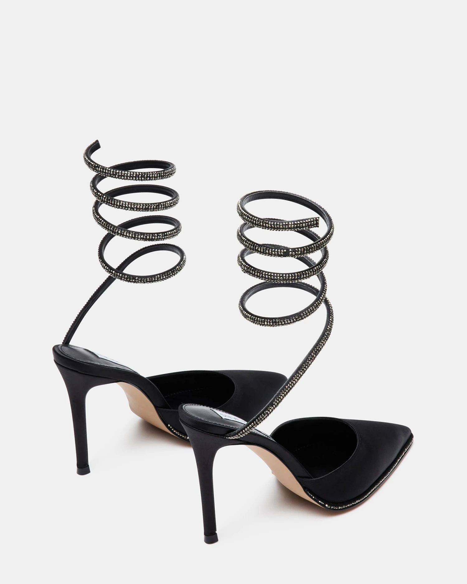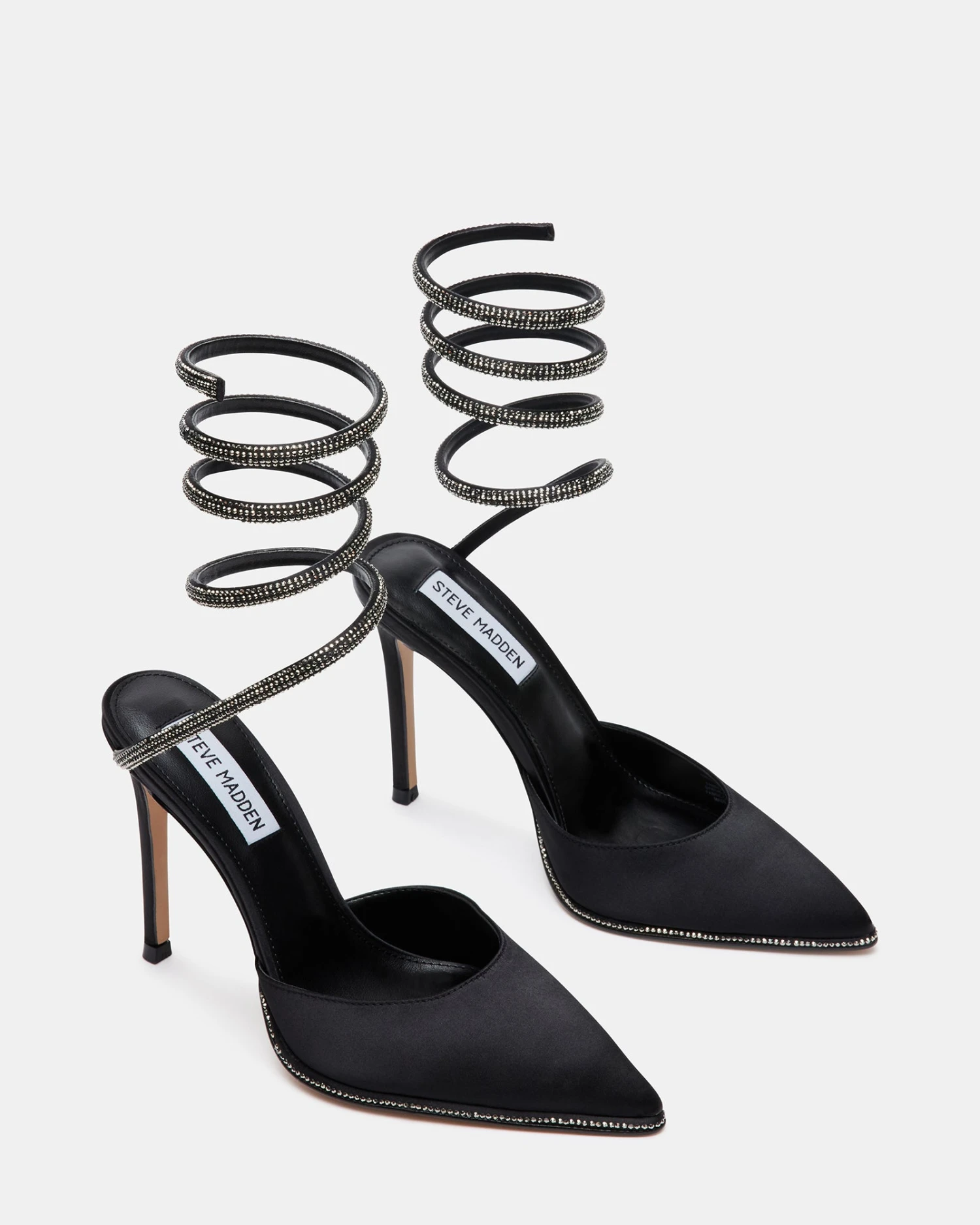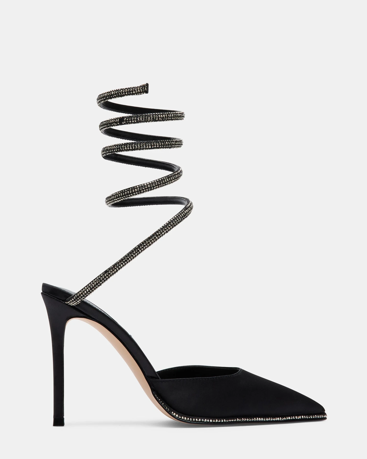 The EMERSON stiletto pump features a point toe and open back secured with a coiled ankle strap. Tiny rhinestones set around the welt of the toe and on the ankle strap add subtle sparkle to your step.