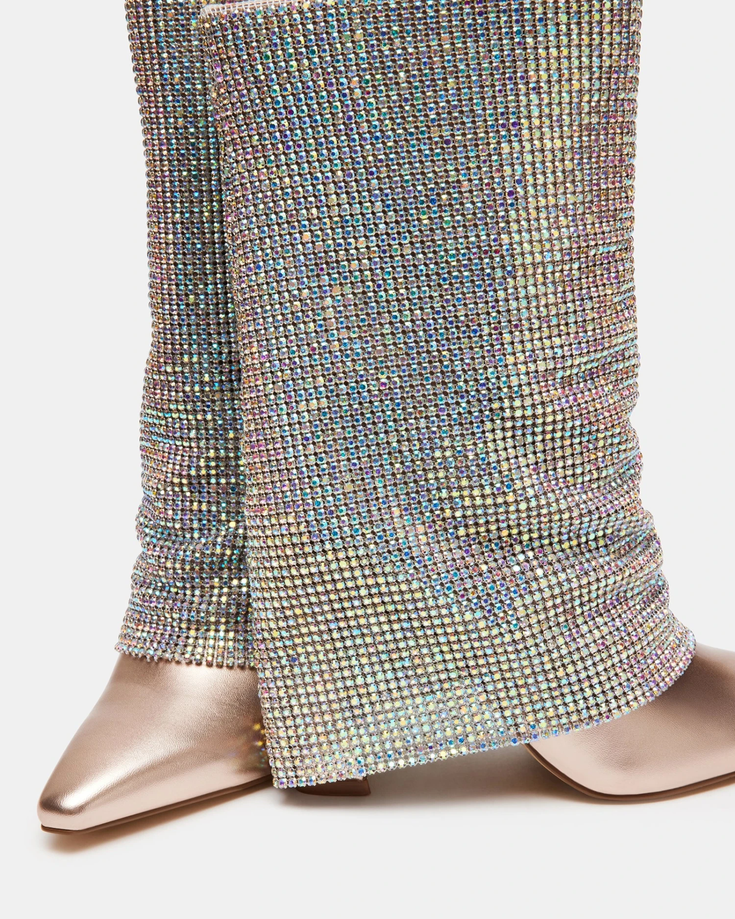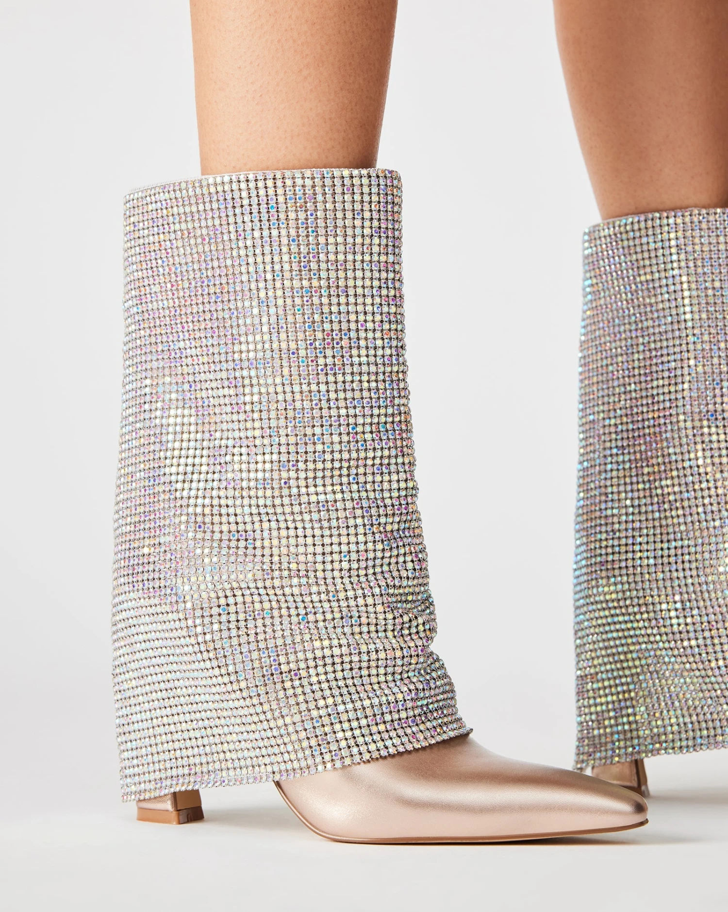 A rhinestone mesh foldover gives the SPARKLE point toe block heel boot shimmering movement that’s designed to catch the light.